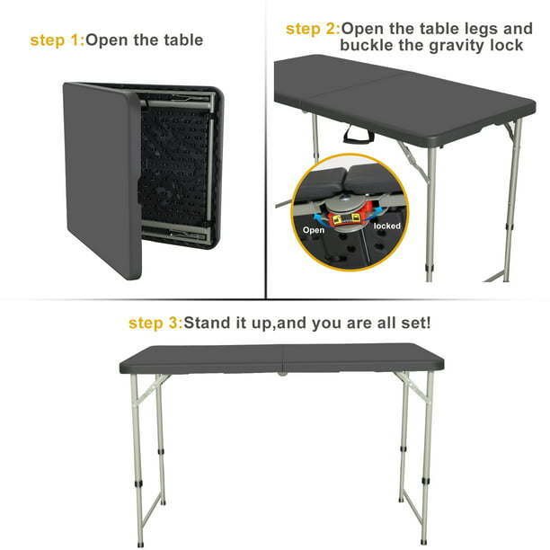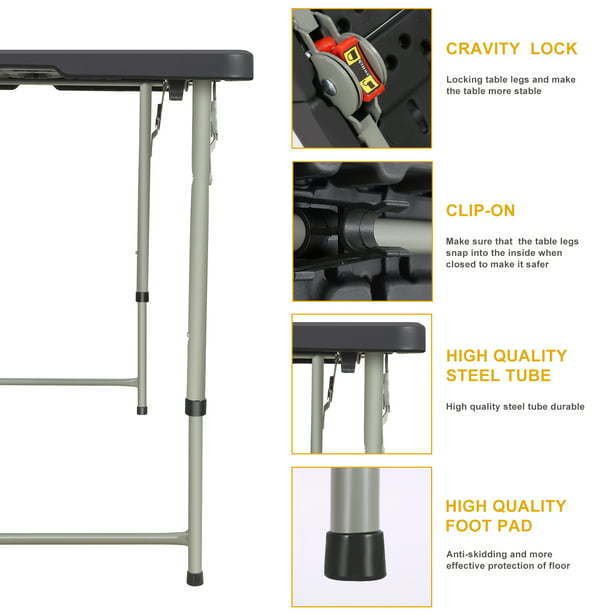 This folding table with height adjustment design brings much convenience for indoor and outdoor activities like camping, picnic, barbecue, party and more.The lightweight picnic table can be easily fold up and comes with a convenient handle, making it easy to store and transport. Three height settings ( 19"/24"/29") meet your multiple demands. The sturdy and anti-rust steel tubes plus thick HDPE tabletop make this folding table super stable and can support plenty of items with ease. The security lock, reinforced triangular structure and non-slip foot pads further enhance overall stability. Furthermore, it's easy to clean the waterproof surface with a damp cloth.