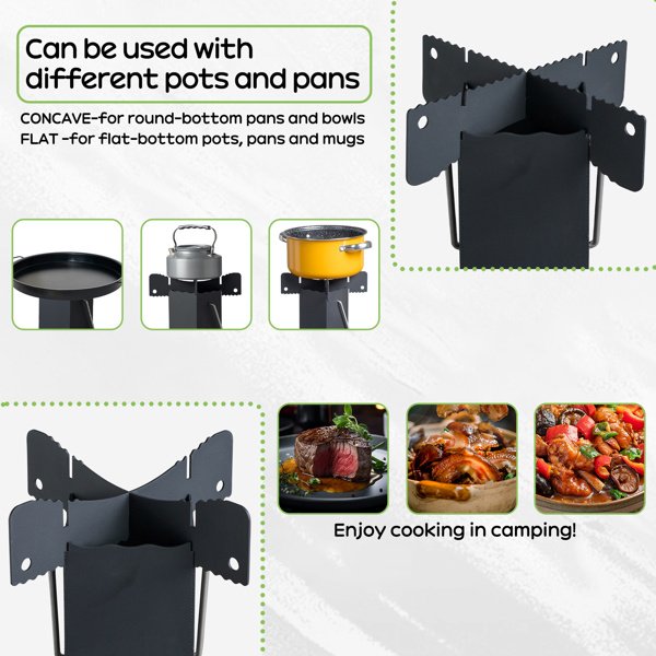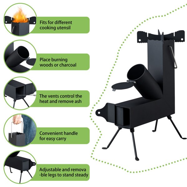 This camping rocket stove is suitable for all outdoor activity times like hunting, fishing, picnic, camping, outdoor events, backyard cooking, etc.No need to carry propane, gas, or other fuels with you. No need to carry propane, natural gas or other fuels. A handful of sticks and wood blocks can be used to prepare a meal outdoors. Provide more convenience for your camping/hunting trip. Enjoy The View Of Burning Fire Flames And The Sound Of Wood Burning!