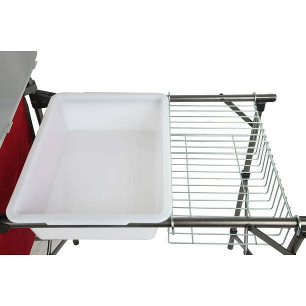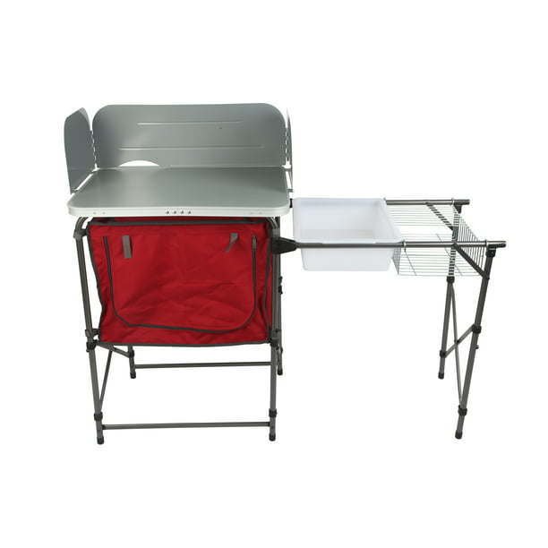 You'll find cooking in the great outdoors that much easier with this Ozark Trail Deluxe Camp Kitchen with Storage and Sink Table. This product is your all-in-one outdoor grill solution. It features a durable steel frame with an easy-to-clean tabletop to set your grill on and removable wind guards. This camping table includes a zipped-up pantry organizer to secure your dishes and dry goods, and its removable plastic sink with a drying rack will take care of the dishes. It packs compactly into the included carry bag to make moving and storing it easy. Whether you're taking the family on an extended camping trip in the mountains or just taking a day trip to a local hiking trail, Ozark Trail has everything you need to enjoy the great outdoors. Browse all our gear like spacious tents, durable backpacks, warm sleeping bags, outdoor cooking supplies, and more. Step up your outdoor adventures with the Ozark Trail Deluxe Camp Kitchen with Storage and Sink Table. 31" x 13" x 8.25, silver"Ozark Trail Deluxe Camp Kitchen with Storage and Sink Table, RedDurable steel frame with easy-to-clean tabletopGrill table top is 19" x 24"Removable windscreen on tabletop WindscreenDimensions (inches): 31" x 13" x 8.25"Pantry organizer with zippered opening and mesh panelOutdoor sink table and drying rack includedTub style sink, no drainHolds up to 65 lbsPacks small into included carry bagAssembly requiredProduct weight: 20 lbsOpen dimensions (inches): 49" x 19.5" x 31.9"Folded dimensions (inches): 33.1" x 26" x 5.9"Model: TA-619, silver