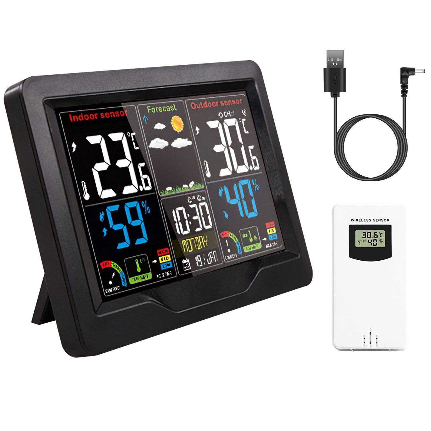 *Multifunctional Home Weather Station*:Our weather clock includes multiple functions,full color display and clear LCD screen allow you to easily read time,date,weekday,indoor and outdoor temperature(°C/°F),humidity,comfort level,weather forecast,mold risk,and more information from different angles and 7 selectable languages. Bring you much more convenience and more comprehensive information.