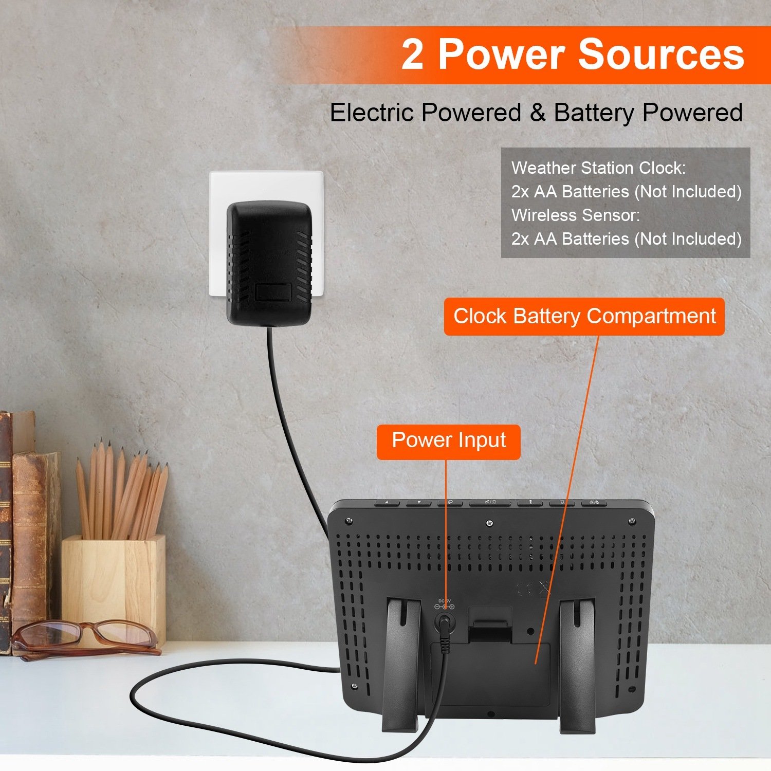 *Dual Power Supply & 4 Brightness*:Dual power sources give you the option to run the weather station clock by electric powered or battery powered. When you choose battery powered,the backlight will automatically turn off after 10s lighting duration to save power. And when you use USB power cord to supply,the backlight brightness can be adjusted in 4 different brightness(High/Medium/Low/Off).