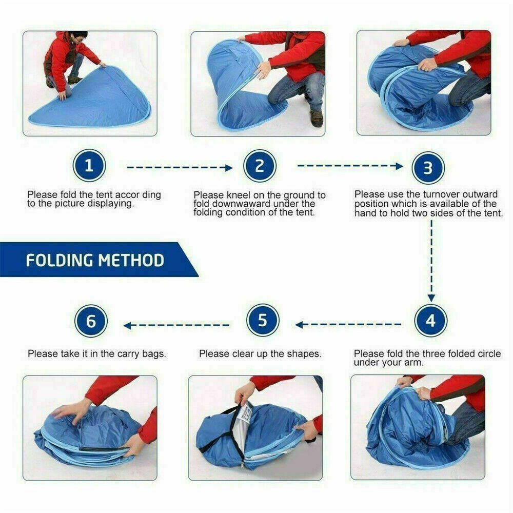 The Double dense interwoven mesh design allows you to shelter from the summer hot wind, external sand pockets and 6 metal nails keep the tent safely weighted down to the ground.