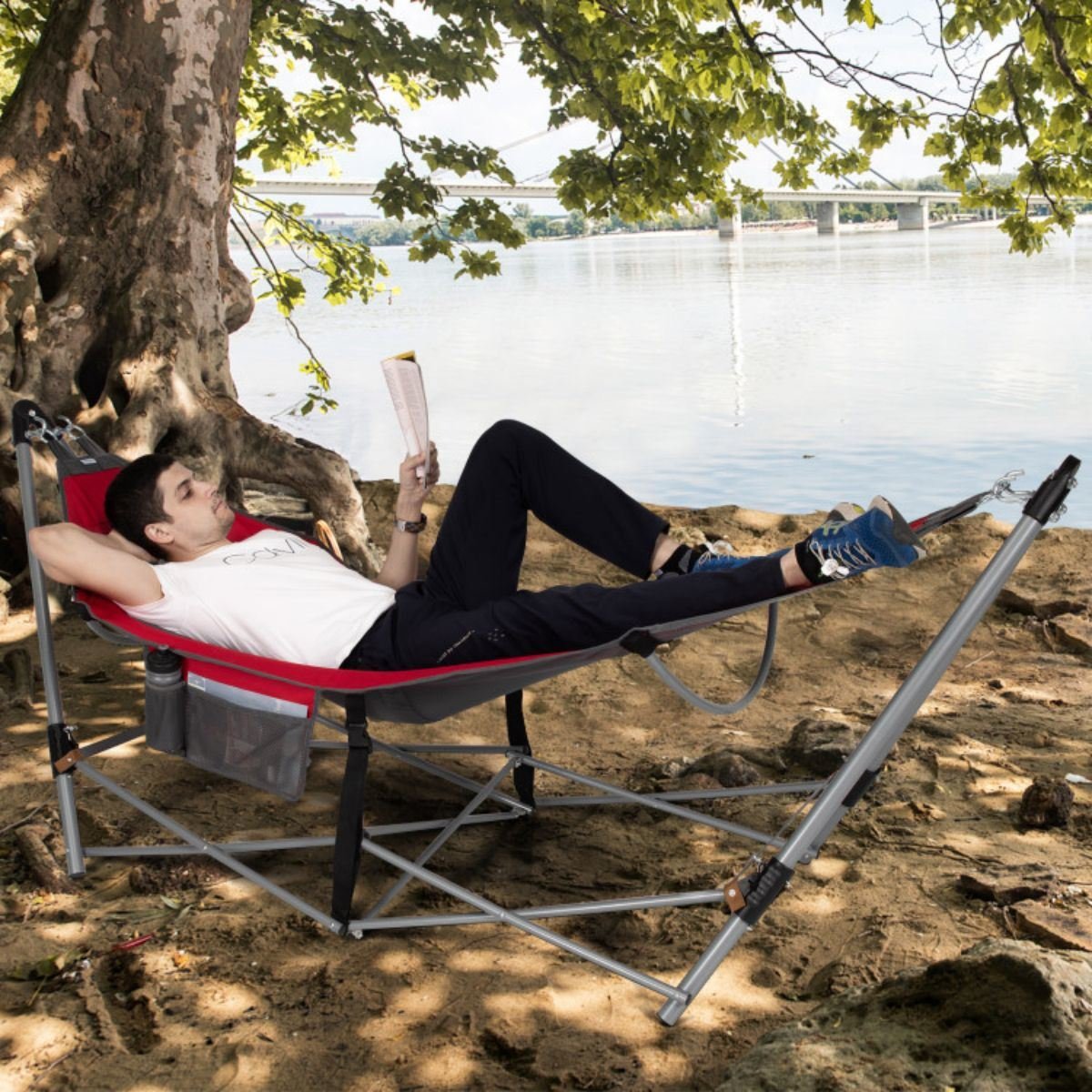3.Compact and Portable Design: This portable folding camping hammock measures 90" x 32.5" x 35" (L x W x H) which is spacious enough to meet your different needs. Furthermore, comes with a carrying bag, the free-standing hammock can be folded for easy storage and transportation.