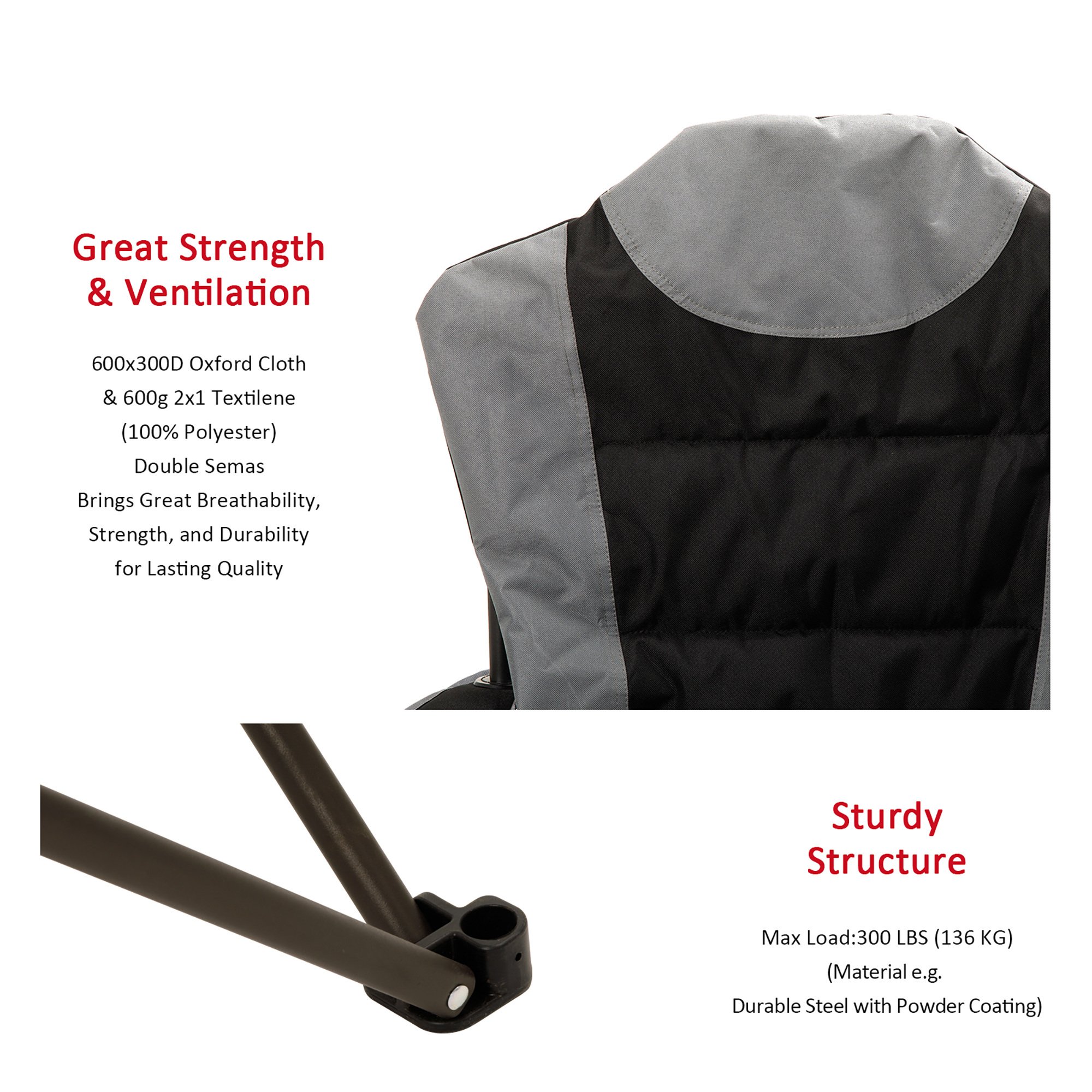 Super Oversized & Maximum Weight Capacity: The super oversized camping chairs size are 28"x42"x41", and the sturdy steel frame construction affords up to 500 LBS (227KG) weight capacity. This super oversized & padded chair high back is your best partner to help you to relax and enjoy your journey.