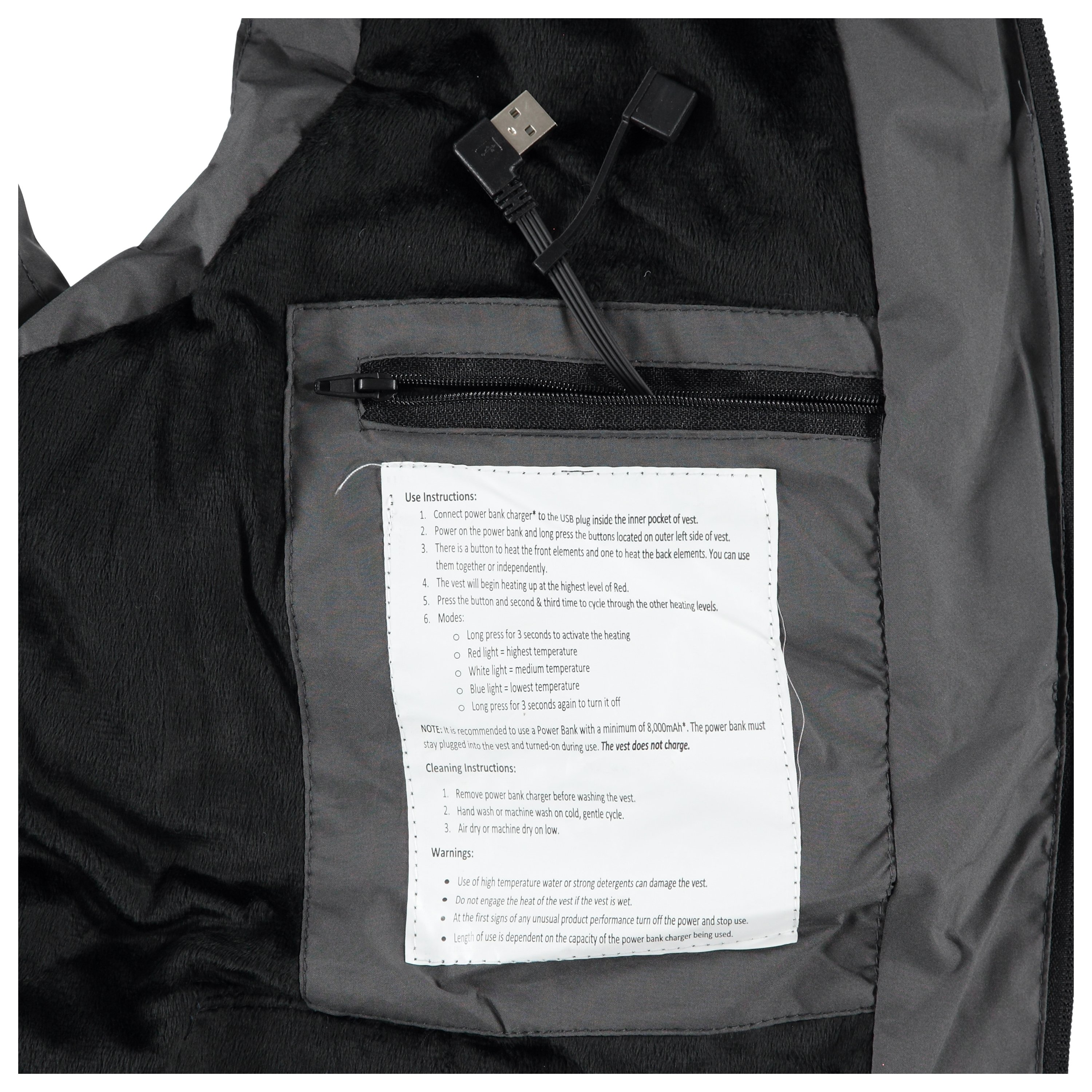 NOTE: It is recommended to use a Power Bank with a minimum of 8,000mAh (Power Bank Not Included). The power bank must stay plugged into the coat and turned-on during use.