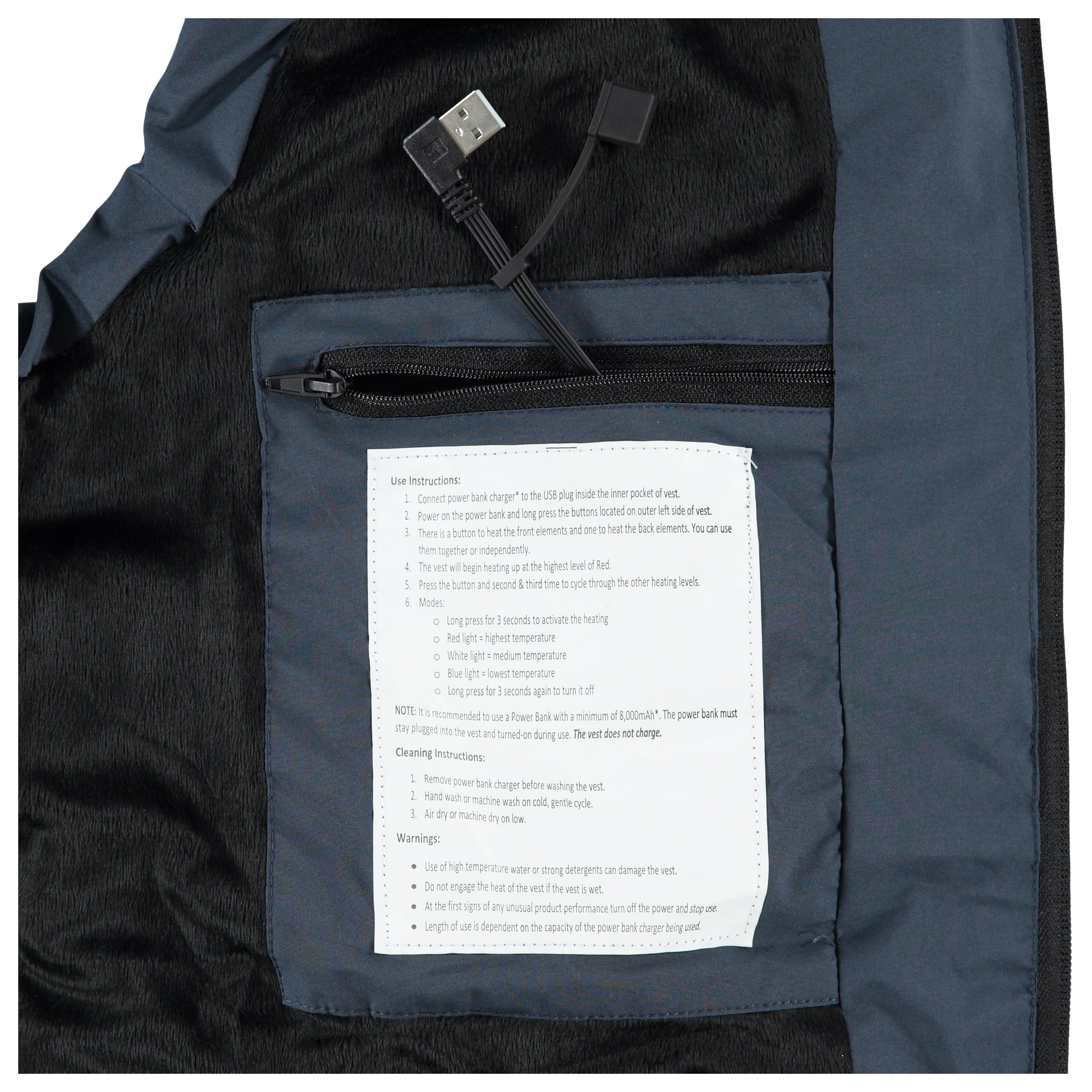 NOTE: It is recommended to use a Power Bank with a minimum of 8,000mAh (Power Bank Not Included). The power bank must stay plugged into the coat and turned-on during use.