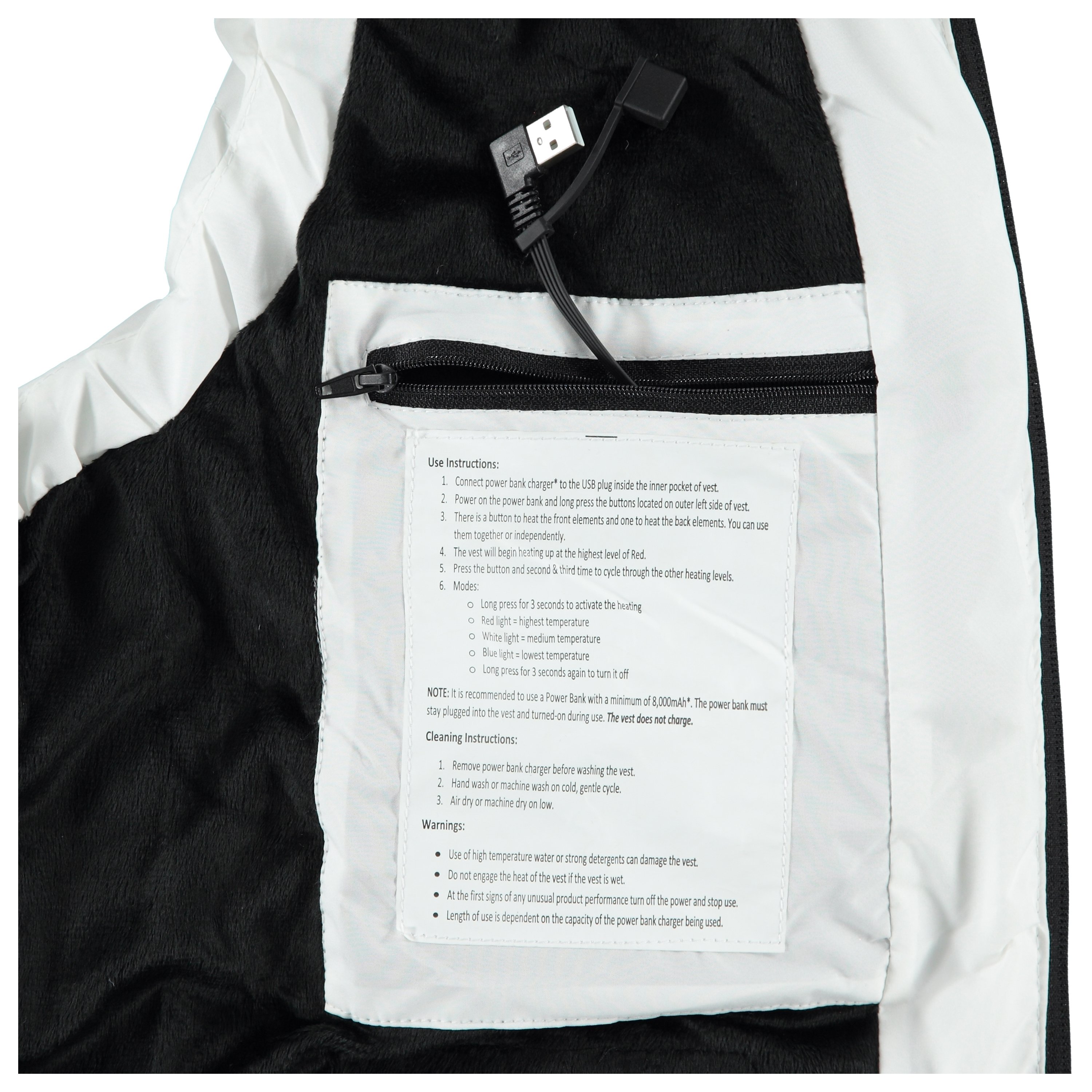 NOTE: It is recommended to use a Power Bank with a minimum of 8,000mAh (Power Bank Not Included). The power bank must stay plugged into the coat and turned-on during use.