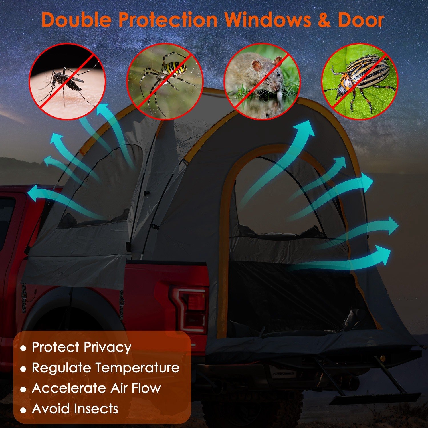 3.Come with 2 symmetrical windows and doors with net and curtain, our tent can effectively prevent mosquito or other insects from crawling into your tent