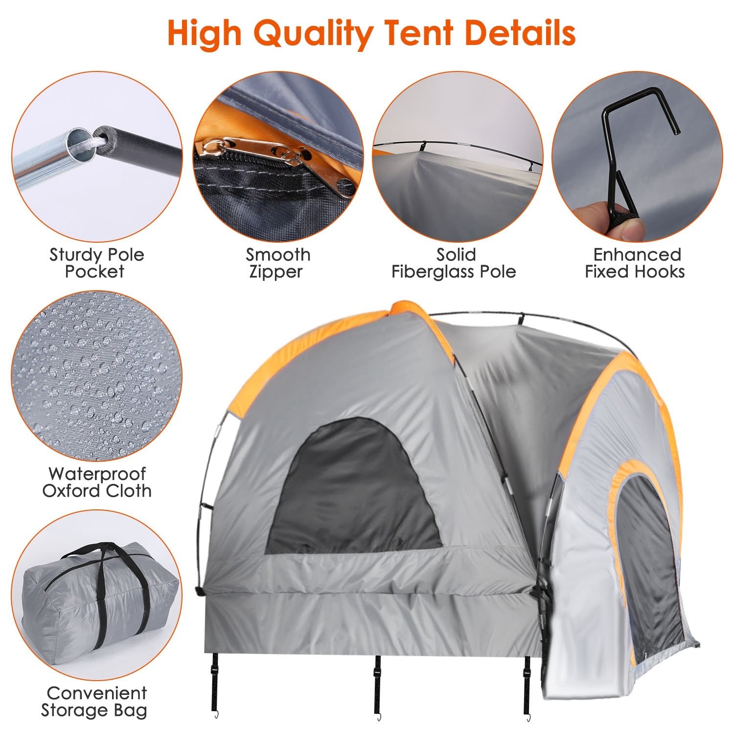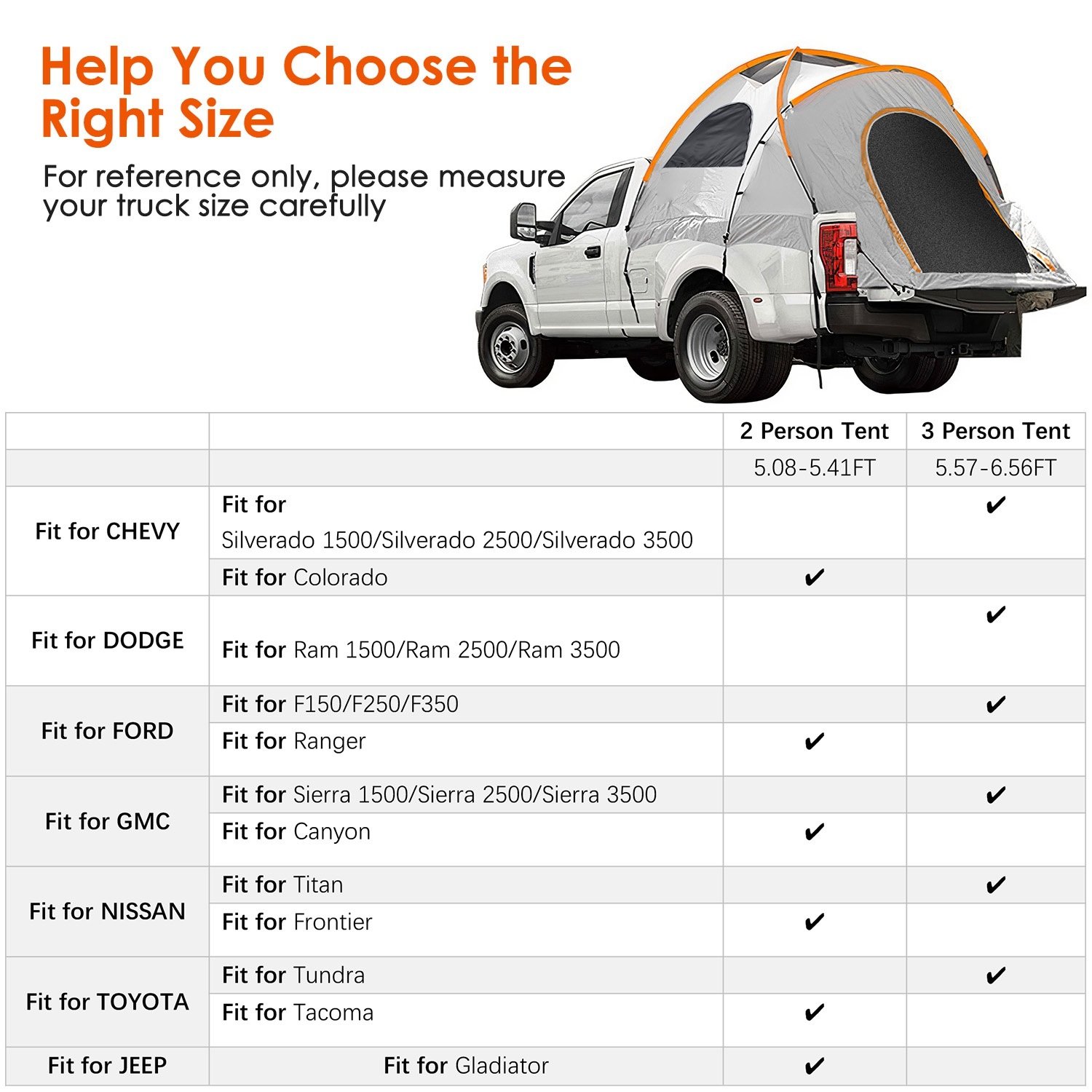 *Wide Compatibility*:2 Sizes option for you,you can purchase the most suitable tent according to your personal demands. Fit for most pickup truck,such as Fit for Ford F150/ Dodge Ram 1500/GMC Sierra/Chevrolet Silverado/Nissan Titan/Toyota Tundra and more. So cool to turn your truck into a moveable house!
