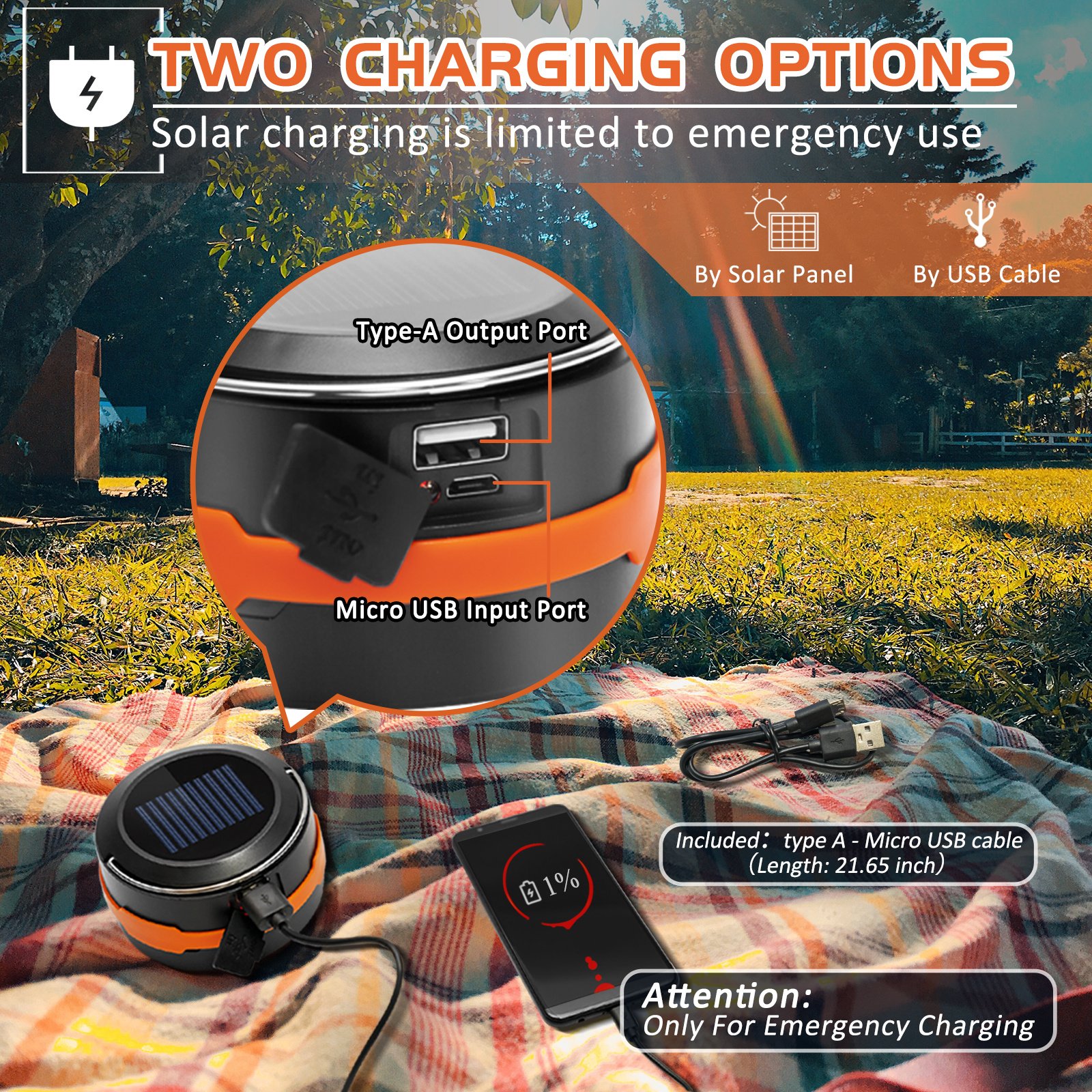• [2 CHARGING METHODS] Can be charged by charging cable or solar energy. A charging cable is included in the package for daily charging, and the rechargeable design will not generate additional waste batteries. There's a small solar panel on top of the camping light, perfect for emergencies in outdoor activities.